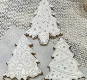 Little Nut Rolls (koachi) – Apricot Stars (kolachi) – Clothespin Cookies – Buckeyes – Snowballs – Pizelles (vanilla) – Chocolate Chip – Peanut Butter Blossoms – Spritz – 7-layer Cookies – Pecan Pie Bars – Raspberry Jam Bars – Decorated Cut-out Cookies (see sample above) – Butter Dreams